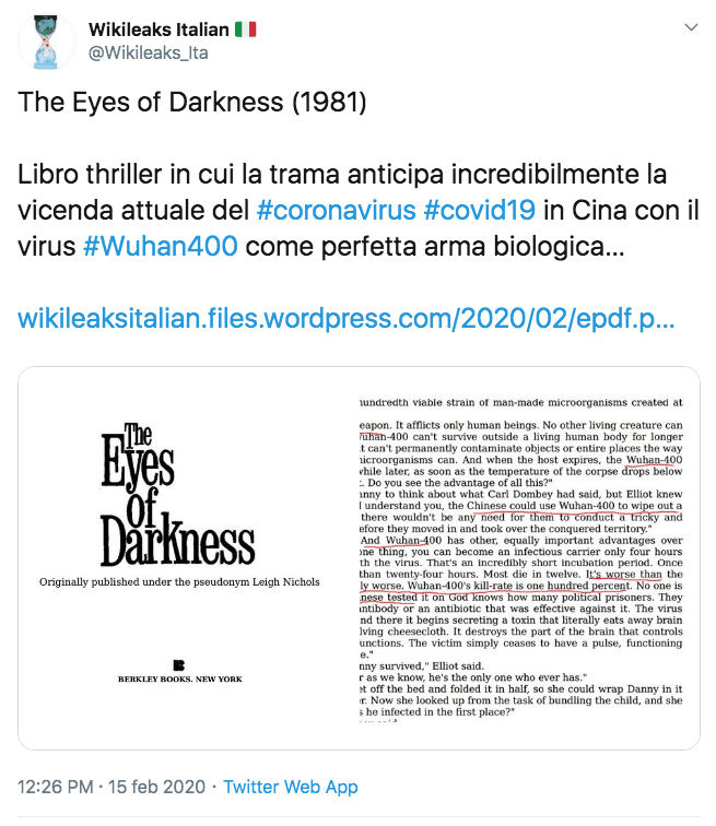 Le analogie tra la realtà ai tempi del Coronavirus e il romanzo è il giornalista informatico Paolo Attivissimo, che nel suo blog ha scritto: “È pressoché inevitabile che tra i milioni di storie scritte prima o poi qualcuna ci azzecchi (le caratteristiche del Wuhan-400 divergono fortemente da quelle del coronavirus). Oltretutto Koontz ha pubblicato più versioni del suo romanzo cambiandone i dettagli. In quella originale, uscita nel 1981, non si parla di Wuhan ma della città sovietica di Gorki, e del virus Gorki-400. Divenne Wuhan nell’edizione del 1996”, quando l’Unione sovietica non esisteva più e “la Cina sembrava una fonte più credibile”.