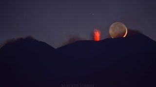 “Era da poco passato il tramonto di martedì 25 febbraio, erano le 18,30 circa”, spiega Alberto. “La foto dell’Etna e la Luna è stata fatta a 15 km circa dalla cima del vulcano (in linea d’aria), da Fiumefreddo di Sicilia per la precisione”.