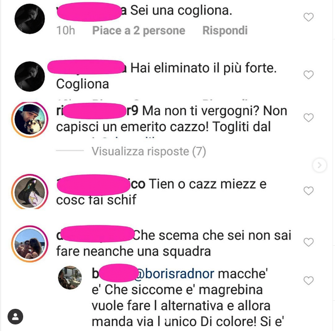 Malika Ayane ha pubblicato gli insulti che ha ricevuto dopo l’eliminazione di Michele Sette, uno dei concorrenti in gara a X Factor 2019. “Cretina, non capisci un ca…”, “Sei magrebina e vuoi fare l’alternativa eliminando l’unico di colore”, “Tieni il ca…. in mezzo alle cosce”, “Putt… razzista”, sono solo alcuni dei commenti che la cantante in giuria ha ricevuto dagli haters.