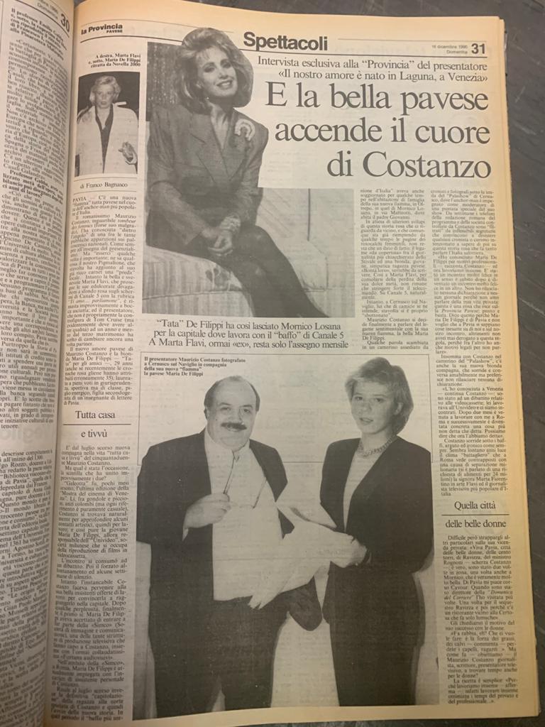 Maria, te lo confesso ora: purtroppo non l’ho mai fatto e me ne pento amaramente, perché all’epoca i quattrini sarebbero stati davvero parecchi. La pagina della Provincia Pavese uscì il 16 dicembre 1990 (titolo: “E la bella pavese accende il cuore di Costanzo“) e la notizia fu ripresa da tutti i giornali, telegionali, radiogiornali, settimanali e perfino bollettini parrocchiali del Regno. Costanzo e De Filippi si sposarono cinque anni dopo, il 28 agosto 1995