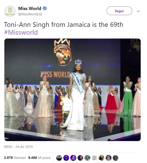 La nuova Miss Mondo è la giamaicana Toni-Ann Singh. 23 anni, psicologa di professione, è stata incoronata a Londra. Già miss Giamaica, la ragazza, che si è laureata alla Florida State University, ha twittato: “A quella bambina di St. Thomas, in Giamaica e a tutte le ragazze di tutto il mondo dico: per favore, credi in te stessa. Sappi che sei degna e capace di realizzare i tuoi sogni. Questa corona non è mia ma tua. Hai uno scopo“.