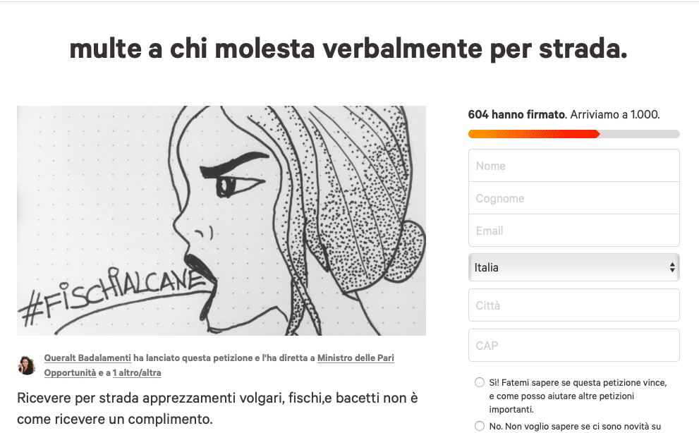 Perché se in Francia un molestatore rischia dai 70 ai 700 euro, in Italia non rischia nulla? Qui puoi anche alzare il telefono e chiamare la polizia, ma l’unica risposta che riceverai è: signorina, noi non possiamo fare niente, possiamo solo accompagnarla a casa e tenerle compagnia finché non arriva. Questo però non ha senso. Non mi aspetto di cambiare il mondo con la mia petizione, ma mi sto impegnando per non lasciare che si trasformi in un fuoco di paglia.