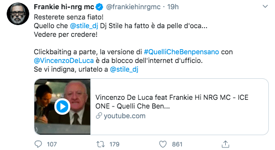 “Resterete senza fiato! Quello che DJ Stile ha fatto è da pelle d’oca… Vedere per credere!”, l’endorsement arriva direttamente dal rapper Frankie HI-NRG MC su Twitter. Si riferisce al video postato da Federico Ferretti, ai più conosciuto come “Dj Stile”, in cui l’hit del 1997 di Frankie Quelli che benpensano è interpretato dal presidente della Regione Campania, Vincenzo De Luca, usando frammenti dei suoi discorsi. Non si tratta di una trovata del Presidente della Regione Campania per avvicinarsi agli amanti del rap anni Novanta, ma di un “deep-fake” di assoluto pregio.