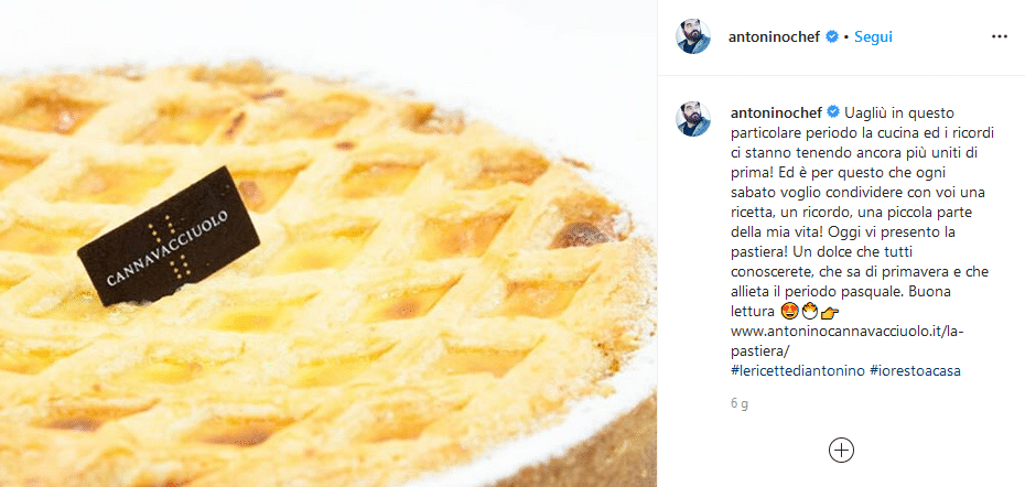 Come molti suoi colleghi, Cannavacciuolo ha deciso di condividere una ricetta a settimana sul web con i propri follower e, quella di questa settimana, riguarda proprio la pastiera napoletana. “Associo la pastiera ai profumi della Pasqua e dei campi primaverili in fiore. In quel periodo dell’anno, tra le case e i giardini di Ticciano aleggiava il profumo della pastiera cotta nei forni, una dolce fragranza di canditi, fiori d’arancio e cannella”, scrive lo chef in una dedica d’amore alla sua ricetta. “Ogni volta che lavoro gli ingredienti della pastiera, il ricordo vola alla felicità.”