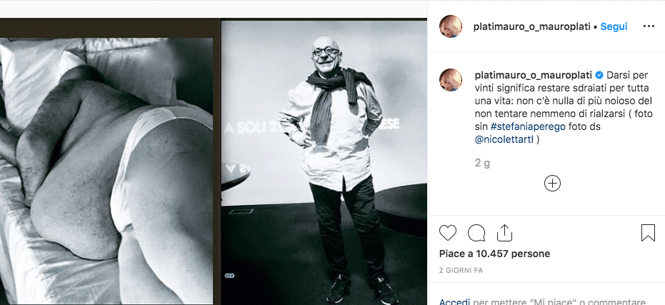 Un Platinette dimagrito scrive su Instagram: “Darsi per vinti significa restare sdraiati per tutta una vita: non c’è nulla di più noioso del non tentare nemmeno di rialzarsi”.