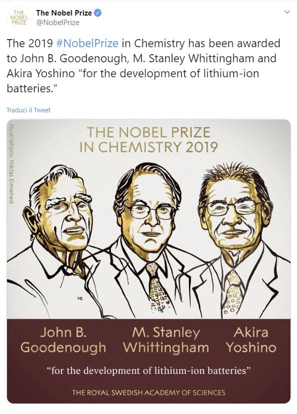 Il Nobel per la Chimica 2019 è stato assegnato agli inventori delle batterie agli ioni di litio, John B. Goodenough, M. Stanley Whittingham e Akira Yoshino.