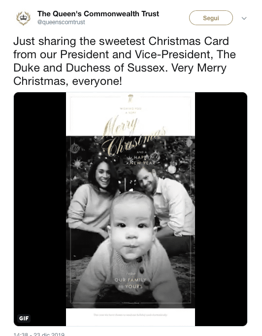 I duchi di Sussex hanno risposto con il sorriso. Meghan e Harry hanno infatti condiviso la cartolina di Natale di famiglia ufficiale del Queen’s Commonwealth Trust, organo del quale sono presidente e vice presidente, in compagnia del piccolo Archie.