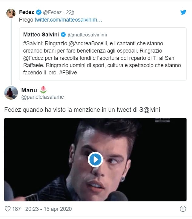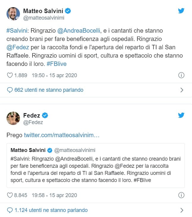 Salvini infatti con un tweet ha ringraziato Fedez e Chiara Ferragni per aver lanciato la raccolta fondi su Gofundme per incrementare il numero dei posti letti della terapia intensiva del San Raffaele di Milano. Il leader leghista ha poi ringraziato anche Andrea Bocelli e gli altri cantanti che hanno composto canzoni per raccogliere fondi a favore degli ospedali, oltre a tutti i personaggi del mondo della cultura e dello spettacolo che con il loro contributo stanno dando una mano alla lotta al Coronavirus.