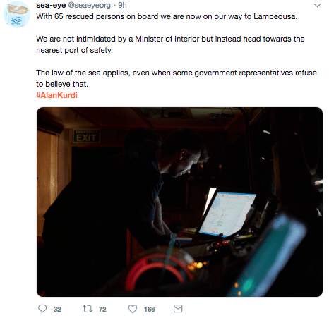 La nave della Ong Sea Eye è intanto diretta verso Lampedusa. “Con 65 persone soccorse a bordo ci stiamo dirigendo verso Lampedusa. Non siamo intimiditi da un ministro dell’interno ma siamo diretti verso il più vicino porto sicuro. Si applica la legge del mare, anche quando qualche rappresentante di governo rifiuta di crederlo”. Così lo staff aveva annunciato in un tweet l’intenzione di dirigersi verso il porto siciliano dopo il salvataggio.