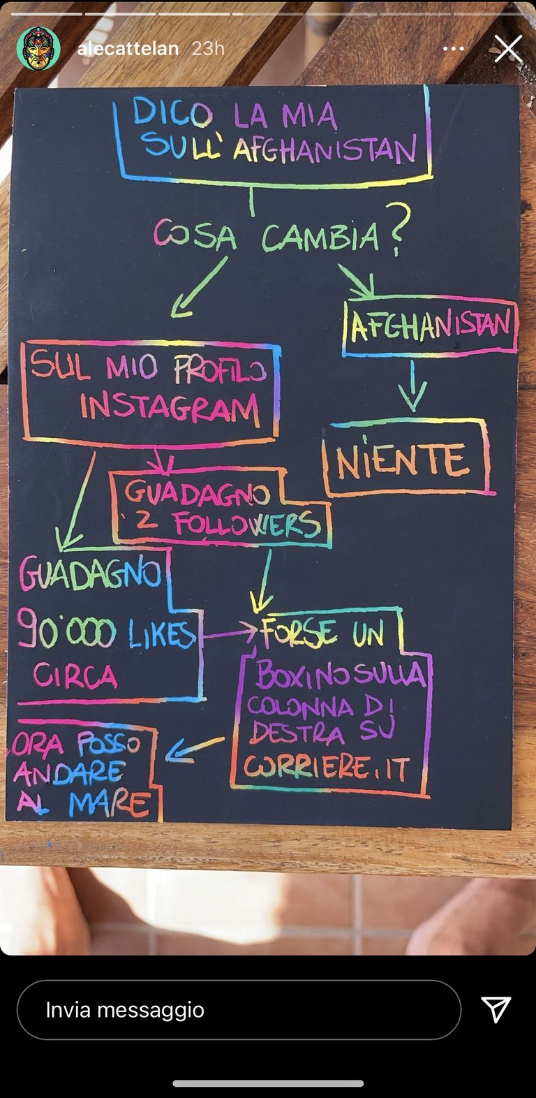 “Prendendo per esempio la situazione Afghana, mi sono permesso di creare un piccolo schema di quello che credo sia l’apporto di noi artisti sui social rispetto a situazioni di cui ignoriamo la complessità e cosa cambi nel concreto, usando però colori alla moda”, ha scritto Cattelan.