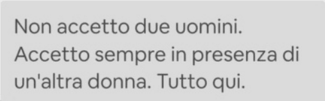 Alla richiesta di delucidazioni da parte del ragazzo, la proprietaria dell’appartamento è stata molto più esplicita rispondendo: “Non accetto due uomini. Accetto sempre in presenza di un’altra donna”.