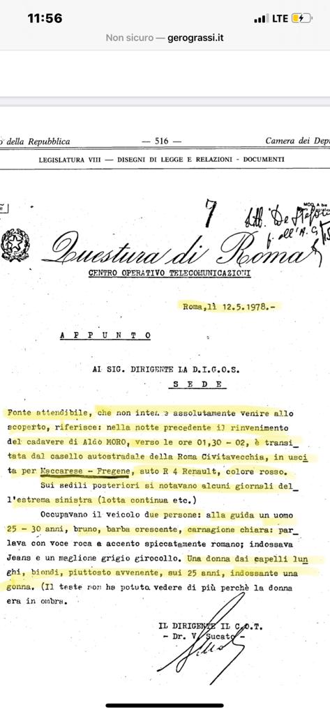 Tra le carte dell’inchiesta, sempre in relazione alla R4, compare infine una nota così concepita: “Fonte attendibile che non intende venire allo scoperto, riferisce che nella notte precedente il rinvenimento del cadavere di Aldo Moro, verso le 01,30-0,2 è transitata al casello autostradale della Roma Civitavecchia, in uscita per Maccarese Fregane, auto R4 Renault, colore rosso,. Sui sedili posteriori alcuni giornali dell’estrema sinistra. Occupavano il veicolo due persone: alla guida un uomo 25-30 anni, bruno, barba crescente, carnagione chiara, parlava con voce roca e accento spiccatamente romano, indossava jeans e un maglione grigio girocollo. Una donna dai capelli lunghi, biondi, piuttosto avvenente, sui 25 anni, indossante una gonna (il teste non ha potuto vedere di più perché la donna era in ombra)”. A firmare la nota è il dirigente del C.O.T., centro operativo telecomunicazioni della Questura di Roma, V:Sucato, la nota è diretta al dirigente della Digos di Roma.
