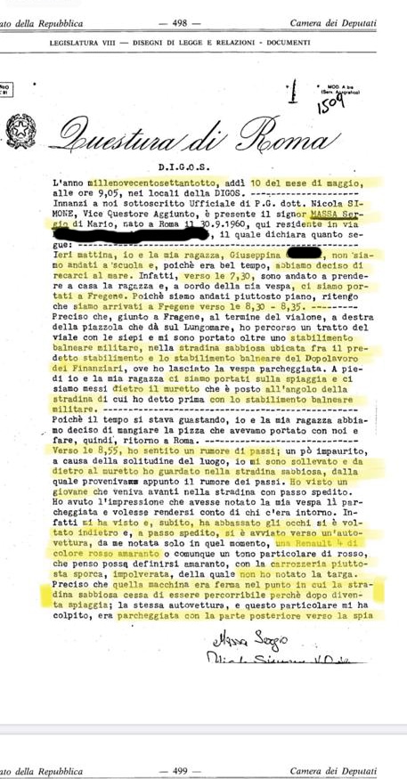 Il verbale è intestato Digos ed è redatto da Nicola Simone alle ore 9,05. Ad essere sentito come testimone è il giovane Sergio Massa, residente a Roma, studente poco più che diciassettenne. Il 9 maggio con la sua fidanzata (Giuseppina R.) visto che era bel tempo Sergio Massa aveva deciso di non andare a scuola e a bordo della sua vespa, dopo essere passato sotto casa della ragazza a prenderla, si era diretto al mare, a Fregene. Partito alle 7,30 era arrivato viaggiando a velocità moderata alle 8,30.