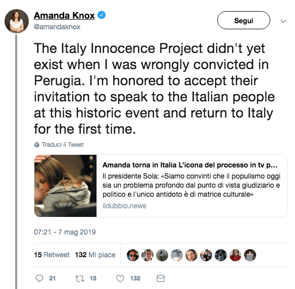 “l’Italy Innocence Project non esisteva ancora quando fui erroneamente condannata a Perugia” scrive nel post.