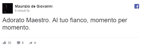 Tra i primi a scrivere sui proprio social, il collega di gialli di Camilleri, lo scrittore Maurizio De Giovanni, che con un post sul suo profilo Facebook ha scritto: “Adorato Maestro Al tuo fianco, momento per momento.”