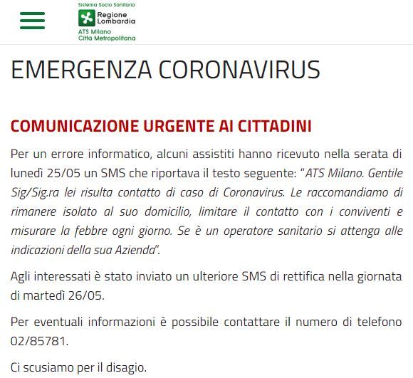 La Regione Lombardia, attraverso una comunicazione urgente ai cittadini pubblicata sul suo sito, ha spiegato cosa è successo: “COMUNICAZIONE URGENTE AI CITTADINI Per un errore informatico, alcuni assistiti hanno ricevuto nella serata di lunedì 25/05 un SMS che riportava il testo seguente: “ATS Milano. Gentile Sig/Sig.ra lei risulta contatto di caso di Coronavirus. Le raccomandiamo di rimanere isolato al suo domicilio, limitare il contatto con i conviventi e misurare la febbre ogni giorno. Se è un operatore sanitario si attenga alle indicazioni della sua Azienda”. Agli interessati è stato inviato un ulteriore SMS di rettifica nella giornata di martedì 26/05. Per eventuali informazioni è possibile contattare il numero di telefono 02/85781. Ci scusiamo per il disagio“.