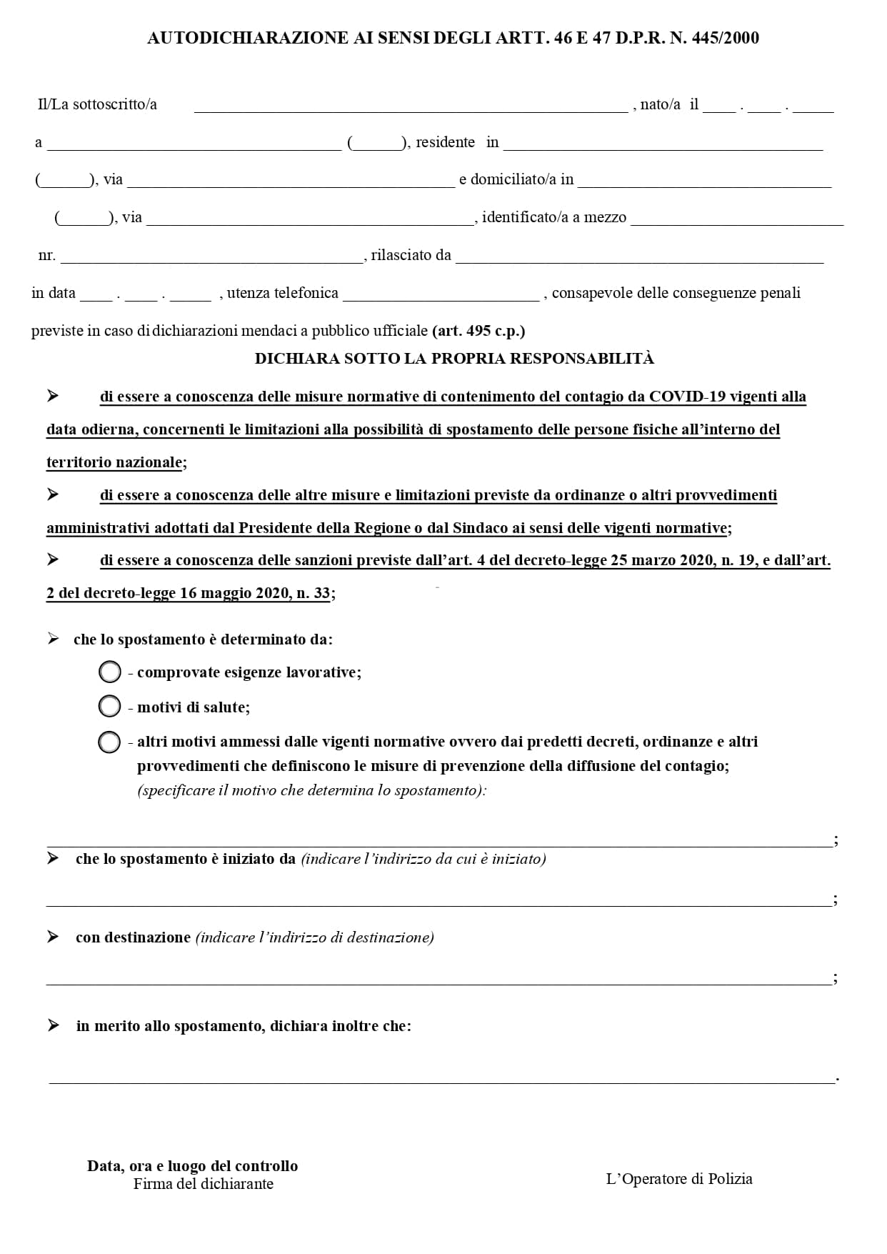 Da domani, lunedì 28 dicembre 2020, tutta l’Italia diventa zona arancione (leggi qui cosa cambia) fino al 30 dicembre: per alcuni, spostamenti, tuttavia, sarà ancora necessaria l’autocertificazione, il cui modulo pdf si può scaricare dal sito del ministero dell’Interno e qui.