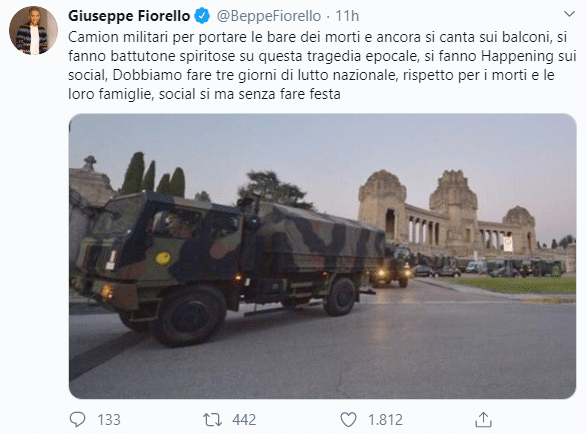 Il corteo di mezzi militari che trasportano le bare da Bergamo perché i cimiteri sono pieni e non hanno più posto per seppellire i propri cittadini: l’agghiacciante immagine di ieri sera ha colpito tutti e Beppe Fiorello ha lanciato un appello via social, rivolgendosi agli italiani. “Camion militari per portare i nudi dei morti e ancora si canta sui balconi si fanno battutone spiritose su questa tragedia epocale, si fanno happening sui social. Dobbiamo fare tre giorni di lutto nazionale, rispetto per i morti e per le loro famiglie. Social sì, ma senza fare festa”.