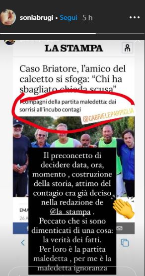 Bruganelli, su Instagram, ha pubblicato uno screenshot di un articolo de La Stampa, il cui sottotitolo recita: “I compagni della partita maledetta: dai sorrisi all’incubo contagi”. A far perdere le staffe alla moglie di Bonolis è proprio la definizione di “partita maledetta”, come lei stessa ricorda nella didascalia a corredo della sua storia: “Il preconcetto di decidere data, ora, momento, costruzione della storia, attimo del contagio – scrive Bruganelli – era già deciso nella redazione de La Stampa. Peccato che si sono dimenticati di una cosa: la verità dei fatti. Per loro è la partita maledetta, per me è la maledetta ignoranza”.