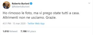 A quel punto il virologo cancella i tweet e ne pubblica un altro: “Ho rimosso le foto, ma vi prego state tutti a casa. Altrimenti non ne usciamo. Grazie”.