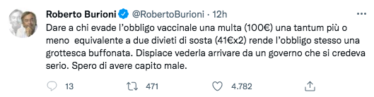 Da domani entrerà in vigore l’obbligo vaccinale per chi ha più di 50 anni, la principale misura introdotta dall’ultimo decreto Covid del governo, valido fino al 15 giugno. Per chi non rispetterà l’obbligo, le sanzioni scatteranno a partire dal primo febbraio, e prevedono il pagamento di una somma una tantum di 100 euro. Secondo quanto riportato da La Repubblica, la sanzione sarà inflitta dall’Agenzia delle entrate, tramite l’incrocio dei dati della popolazione residente con quelli relativi alle anagrafi vaccinali. Le modalità con cui l’obbligo verrà applicato non convincono però il virologo Roberto Burioni che in tweet ha scritto: “Dare a chi evade l’obbligo vaccinale una multa (100€) una tantum più o meno equivalente a due divieti di sosta (41€x2) rende l’obbligo stesso una grottesca buffonata. Dispiace vederla arrivare da un governo che si credeva serio”. Come lui la pensa anche Guido Rasi, ex direttore Ema e consulente del generale Figliuolo, ha qualche dubbio sulla mossa del governo Draghi: “Se è un obbligo mi sembra più di compromesso politico che di numeri epidemiologici. L’obbligo si fa o non si fa, a questo punto. Tra un 49enne e 6 mesi e un 50enne non ho capito come il virus discrimini”.
