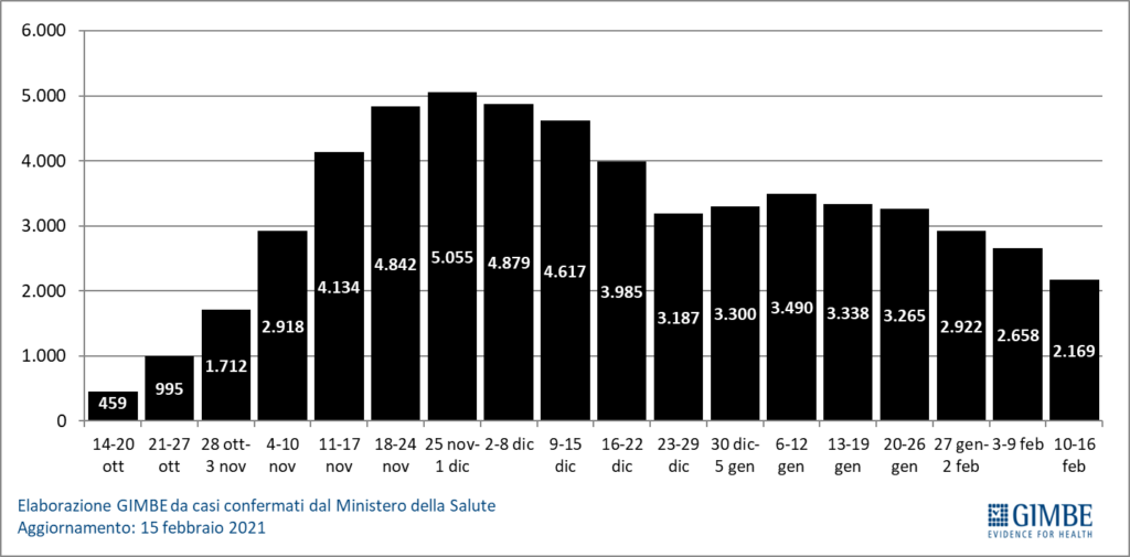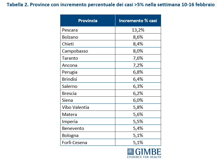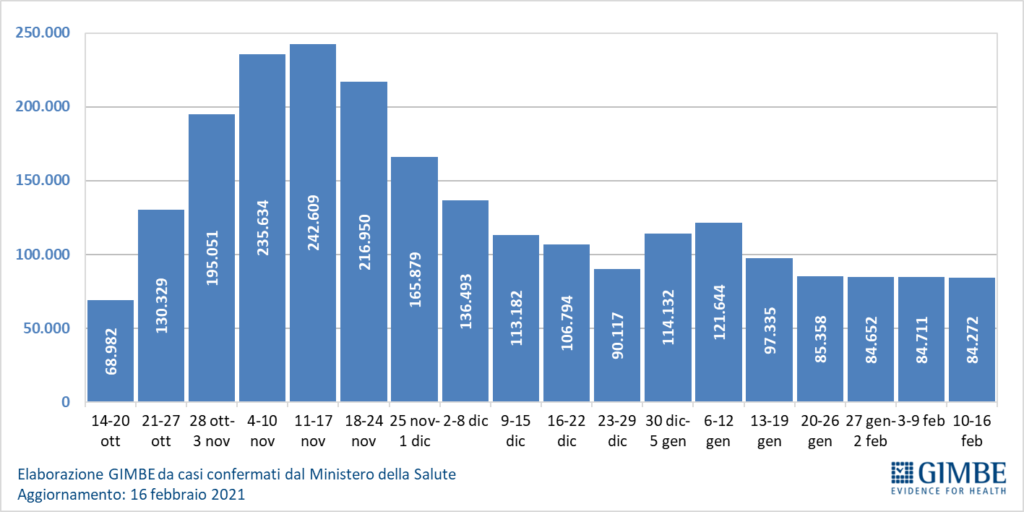 Il monitoraggio indipendente della Fondazione GIMBE sull’andamento del Covid-19 conferma nella settimana dal 10 al 16 febbraio, un numero stabile di nuovi casi rispetto alla precedente (84.272 vs 84.711).