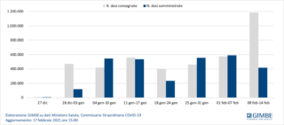 «Per rispettare la tabella di marcia delle forniture – afferma Renata Gili, responsabile Ricerca sui Servizi Sanitari della Fondazione GIMBE – entro fine marzo dovrebbero essere consegnate in media 1,45 milioni di dosi/settimana, a fronte delle quasi 600 mila attuali».