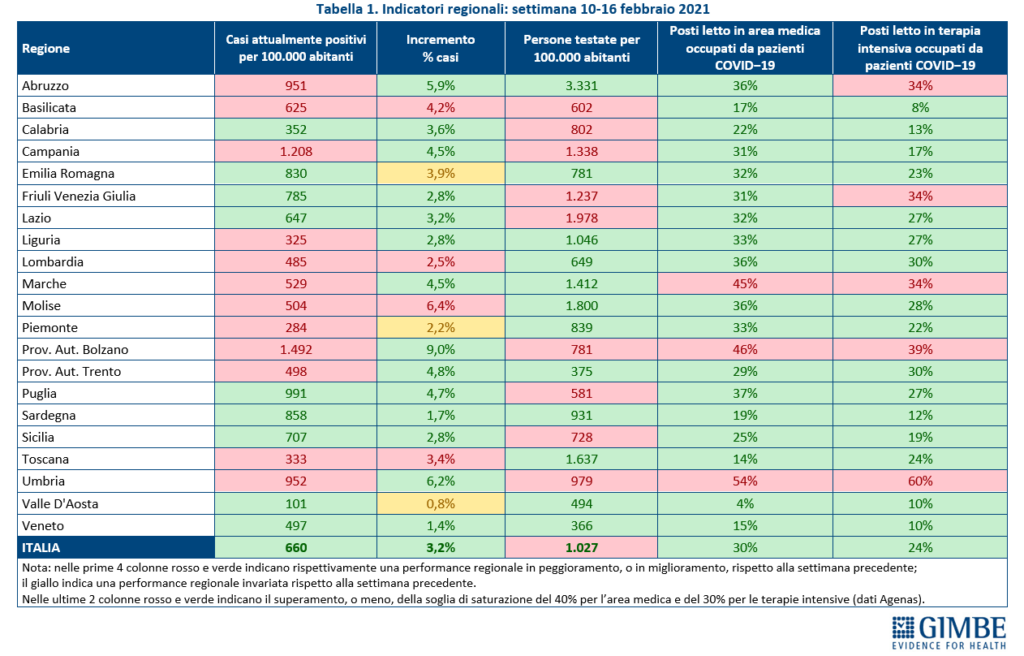 “Anche questa settimana – afferma Nino Cartabellotta, Presidente della Fondazione GIMBE – nonostante i dati riflettano i contagi avvenuti in un’Italia tinta di rosso e arancione, i nuovi casi non accennano a diminuire. E guardando ai dati regionali si rilevano segnali di incremento, favoriti dalla circolazione delle nuove varianti“.