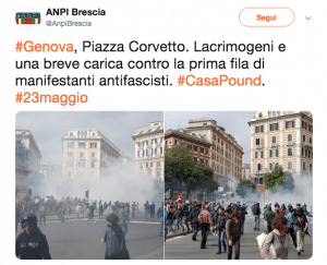 Al grido di “Genova è antifascista” alcuni dei manifestanti sono avanzati sino al blocco organizzato della polizia, all’altezza di piazza Corvetto, adiacente alla zona dove è in programma il comizio del partito di estrema destra, mentre una parte della Cgil è rimasta in picchetto davanti alla prefettura. In piazza Corvetto sono state effettuate anche delle cariche per disperdere i manifestanti.