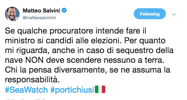 Salvini ha anche chiesto di mettere fuori uso la nave e arresti. “Se nelle prossime ore ci saranno arresti per coloro che hanno infranto le leggi, ci sarà il sequestro definitivo di questa barca di vice scafisti e se ci sarà il loro arresto, è un conto. Se la nave sarà messa fuori uso, anche affondandola, bene. Altrimenti ho il dubbio che qualcuno abbia voluto compiere un atto politico: se qualche procuratore vuole sostituirsi al governo o al Parlamento si candidi”.