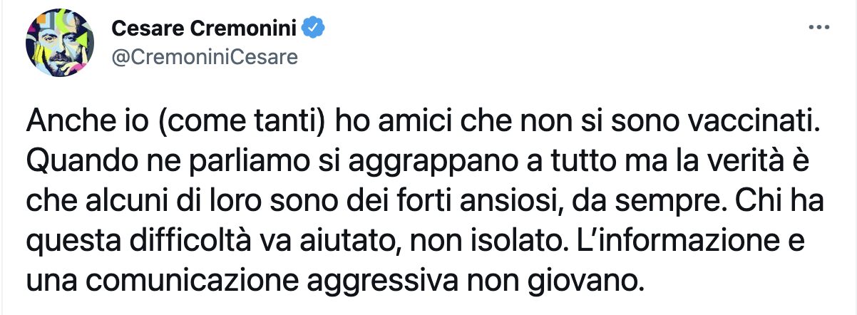 “Anche io (come tanti) ho amici che non si sono vaccinati. Quando ne parliamo si aggrappano a tutto ma la verità è che alcuni di loro sono dei forti ansiosi, da sempre. Chi ha questa difficoltà va aiutato, non isolato. L’informazione e una comunicazione aggressiva non giovano” ha scritto sui social il cantante, aprendo un vero e proprio dibattito sui social.