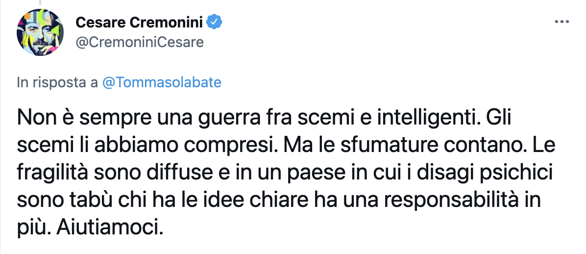 Successivamente, Cremonini ha maggiormente argomentato il suo pensiero, scrivendo sempre sui social: “Non è sempre una guerra fra scemi e intelligenti. Gli scemi li abbiamo compresi. Ma le sfumature contano. Le fragilità sono diffuse e in un paese in cui i disagi psichici sono tabù chi ha le idee chiare ha una responsabilità in più. Aiutiamoci”.