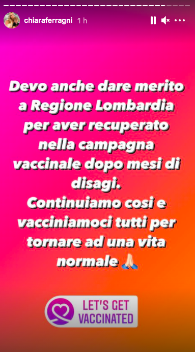 Nelle stories Instagram Chiara Ferragni ha mostrato il suo cerotto al braccio destro dopo il vaccino e ha rilanciato l’appello ai suoi 23,7 milioni di follower: “Fatelo tutti, mi sembra di vedere la luce in fondo al tunnel dopo un anno e mezzo. Questo è l’unico modo per uscire dall’incubo“.
