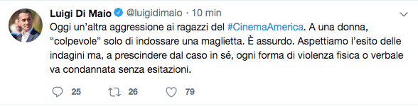 Anche il vicepremier Luigi Di Maio ha censurato l’aggressione con un post, pubblicato anche questo su Twitter.