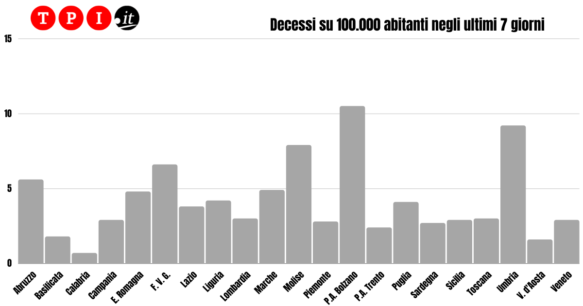 Nella maggior parte delle Regioni italiane i ricoveri in reparto e quelli in terapia intensiva tornano a crescere. I dati dei ricoveri (ma non quelli dei decessi) sono in miglioramento in Umbria, mentre crescono  in Lombardia, Marche e Molise. Ad evidenziarlo sono i grafici elaborati da TPI che mettono a confronto la situazione Regione per Regione. I grafici non partono dai dati assoluti – i numeri dei bollettini che vengono divulgati quotidianamente – ma da quelli relativi, calcolati sui 100mila abitanti, quindi emblematici, perché non influenzati dal numero degli abitanti delle diverse Regioni (qui i dati della scorsa settimana).