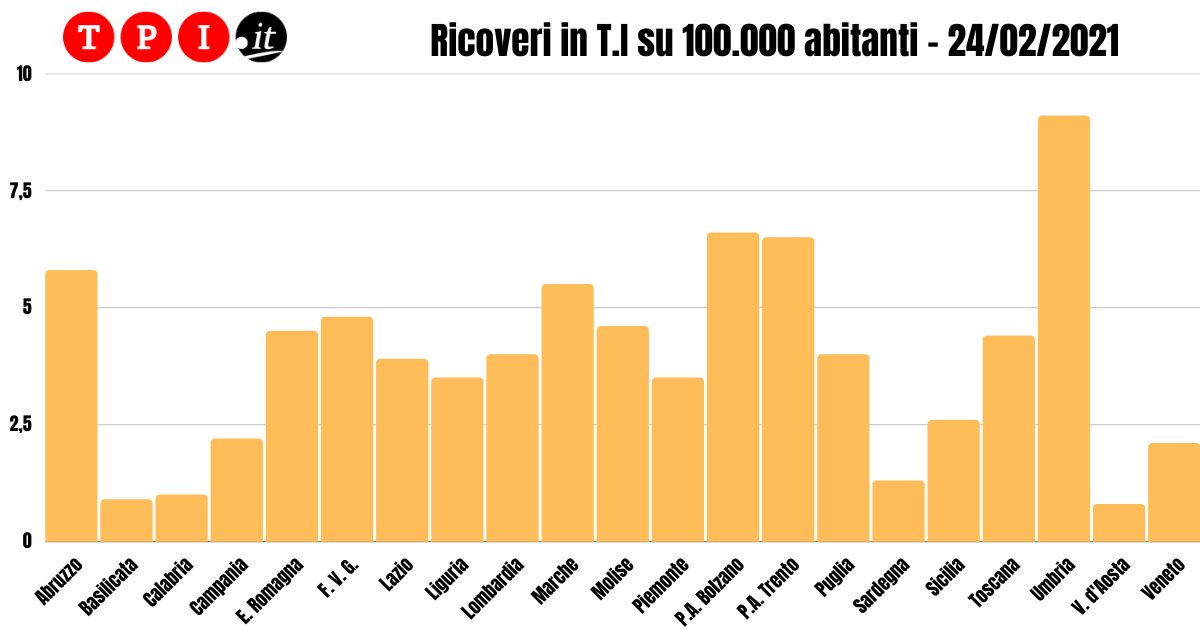 I dati dei ricoveri in terapia intensiva su 100mila abitanti (24.02.2021)