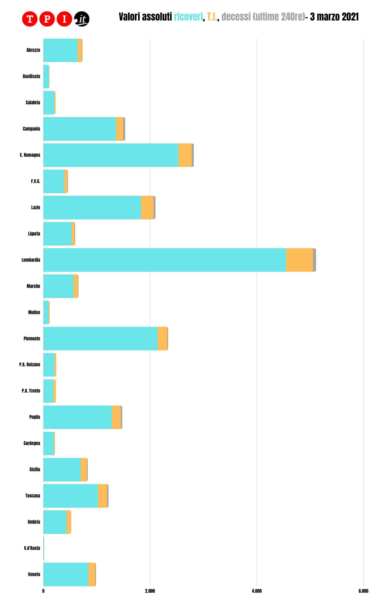 I dati assoluti su ricoveri, terapie intensive e decessi Regione per Regione