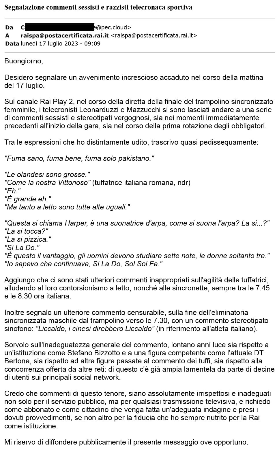 Tra le espressioni dei telecronisti portate all’attenzione di Viale Mazzini lo slogan “Fuma bene, fuma sano, fuma pakistano”. E poi alcuni dibattiti tra i due: “Le olandesi sono grosse”. “Come la nostra Vittorioso”, si rincara la dose facendo riferimento alla tuffatrice azzurra Giulia Vittorioso. “Eh grande eh”, proseguono i due, prima di arrivare a una conclusione ancora più sconcertante. “Tanto a letto sono tutte alte uguali”.