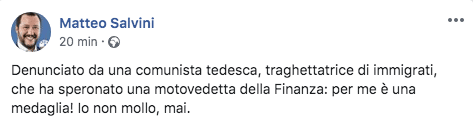 L’ex ministro dell’Interno ha affidato la sua reazione ai social scrivendo, sul suo profilo Facebook: “Denunciato da una comunista tedesca, traghettatrice di immigrati, che ha speronato una motovedetta della Finanza: per me è una medaglia! Io non mollo, mai”.