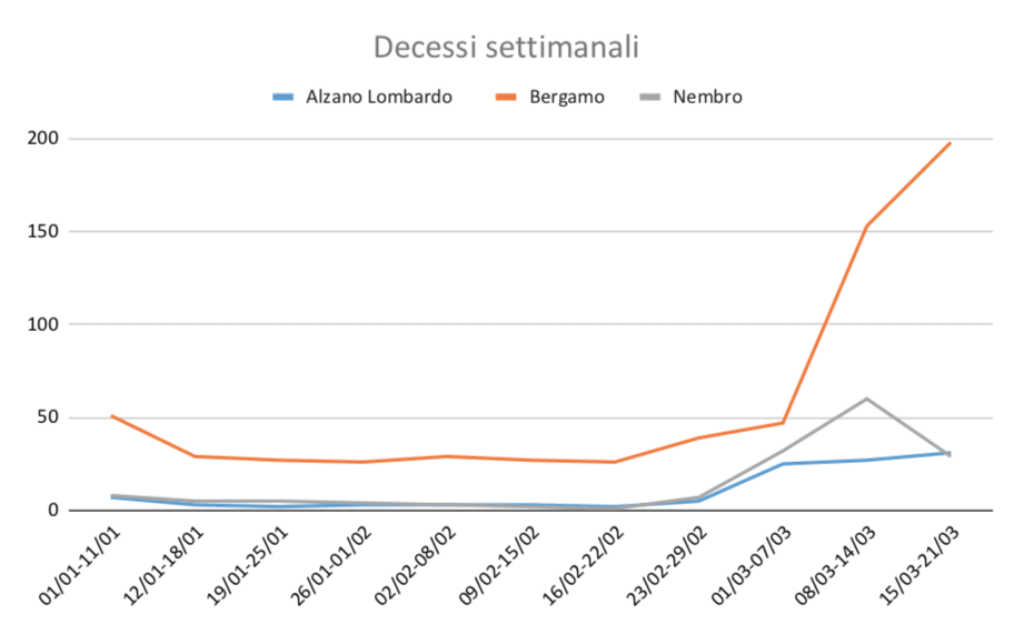 Considerando quindi d’ora in poi i dati Istat, se si guardano le cifre divise per settimana da gennaio a fine marzo, si vede che ad Alzano Lombardo, paese di soli 13.855 abitanti, ci sono stati dall’1 al 13 gennaio 7 morti, poi una media di 3 morti fino al 29 febbraio 2020. Poi il triste e incredibile incremento: dal 1 al 7 marzo 25 decessi, dall’8 al 14 marzo 27, dal 15 marzo al 21 marzo 31 morti. A Nembro a inizio gennaio le persone scomparse erano 8, poi 5, 4, 3, 2… Fino alla settimana dal 1 al 7 marzo con 34 morti, Poi 60 decessi dall’8 al 14 marzo e 29 dal 15 al 21 marzo.