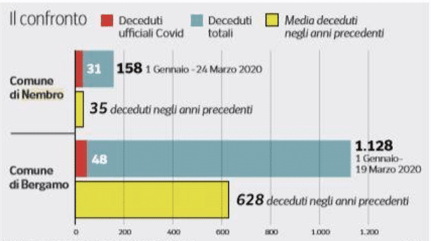 Addirittura, secondo l’analisi svolta da InTwig, società bergamasca di data management e comunicazione ripresa anche dal New York Times per i dati sulla pandemia, a Bergamo e provincia si può stimare che i morti per Covid19 siano stati 4.500 e i contagiati 288mila nel solo mese di marzo 2020, ovvero il 26 per cento degli abitanti (1 su 4) con punte non solo in Val Seriana (46 per cento) ma in Val Bremana (46 per cento), nei laghi (35 per cento) e nell’area urbana di Bergamo (30 per cento).