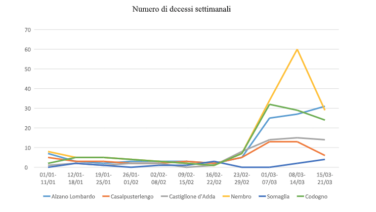 A Codogno, per esempio, ci sono stati tra 1 e 21 marzo 87 morti ed erano 15 nel 2019, un aumento del 480 per cento. O ancora, Casalpusterlengo ha contato 32 morti nel 2020 e 14 morti nel 2019: un incremento del 128 per cento. Sempre alto certo, ma minore rispetto alla Val Seriana.