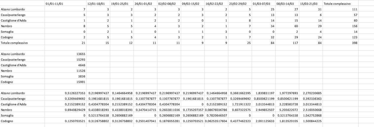 Mentre Alzano e Nembro continuavano a rimanere aperti, da sabato 22 febbraio dieci comuni del basso Lodigiano venivano ufficialmente chiusi in entrata e in uscita, con controlli serrati da parte delle forze dell’ordine e, quando necessario, anche dell’esercito. Si tratta dei comuni di Codogno, Casalpusterlengo, Fombio, San Fiorano, Castiglione D’Adda, Bertonico, Maleo, Somaglia, Castelgerundo e Terranova de’ Passerini. Prendendone due tra i più rappresentativi, cioè Codogno e Casalpusterlengo, dai dati dell’Istat si vede come l’incidenza dei morti dopo la chiusura a zona rossa abbia una curva discendente rispetto a quella di Alzano e Nembro.