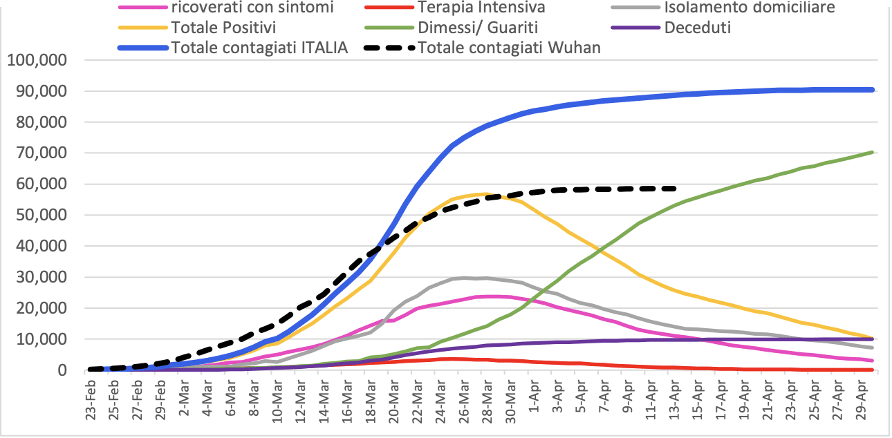 delle persone ancora ammalate (in ospedale + isolamento domiciliare). - Fine dell’epidemia: entro fine aprile si fermeranno i decessi, con pochissimi casi nell’ultima settimana del mese; i pochi positivi che rimarranno, circa 2/3mila, saranno guariti entro i primi di maggio.