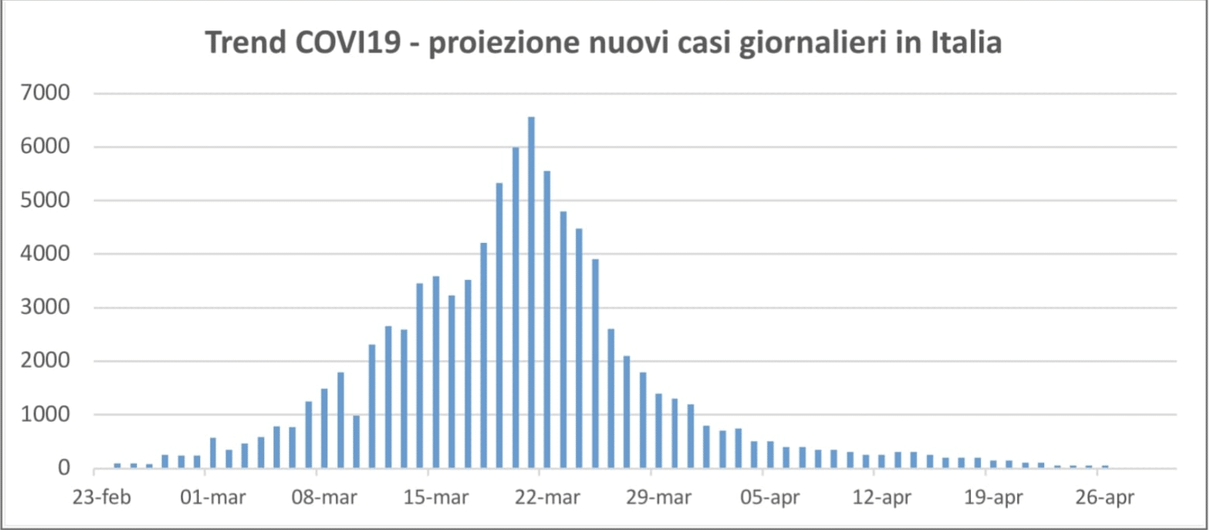 Nel secondo grafico, è proposta la proiezione dei nuovi casi di Covid-19 giornalieri registrati nel nostro Paese. Come evidenzia il grafico, e come anticipato dal grafico precedente, questa settimana è previsto il picco massimo di casi di persone positive al Coronavirus in Italia. Poi, lentamente la curva inizierà a scendere. Alla luce di questi trend, quindi, secondo Daniele Sesini “Saremo sicuramente chiamati a stare in casa fino alla fine di aprile”. Agli inizi di maggio, ci potrebbe essere un lento e graduale ritorno alla normalità con alcune indicazioni da seguire, come ad esempio, continuare ad uscire solo indossando la mascherina e limitando comunque le relazioni sociali per evitare di riaccendere focolai tardivi.