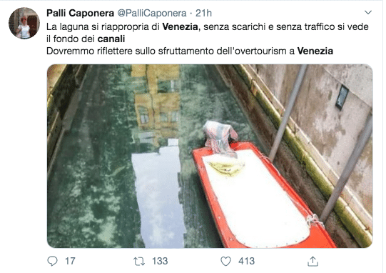 “L’acqua nei canali torna trasparente, l’inquinamento rientra e la natura fa il suo corso. Il #coronavirus spinge tutti a cambiare stile di vita da ora in poi”, commenta invece un altro cittadino.