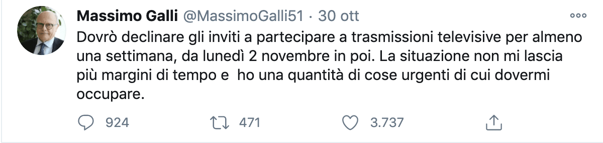 “Basta tv, la situazione non mi lascia più margini di tempo”: ad annunciare il suo “addio” al piccolo schermo a causa dell’aumento dei contagi di Coronavirus è il virologo Massimo Galli. Il direttore/responsabile del reparto Malattie Infettive all’Ospedale Luigi Sacco di Milano ha infatti scritto sul suo profilo Twitter: “Dovrò declinare gli inviti a partecipare a trasmissioni televisive per almeno una settimana, da lunedì 2 novembre in poi. La situazione non mi lascia più margini di tempo e ho una quantità di cose urgenti di cui dovermi occupare”.