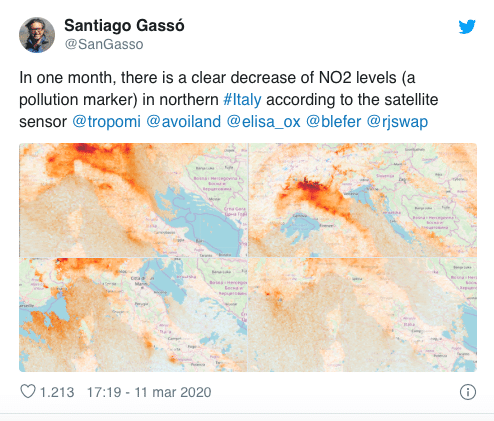 Con il Coronavirus è calato l’inquinamento nel Nord Italia. Come è successo in Cina, anche nel nostro Paese lo stop delle attività e le limitazioni degli spostamenti hanno provocato una riduzione dei livelli di biossido di azoto. Lo dimostrano le immagini del satellite Sentinel 5 del programma europeo Copernicus, gestito da Commissione Europea e Agenzia Spaziale Europea (Esa). Le foto sono state pubblicate su Twitter da Santiago Gassò, ricercatore dell’Università di Washington e della Nasa.