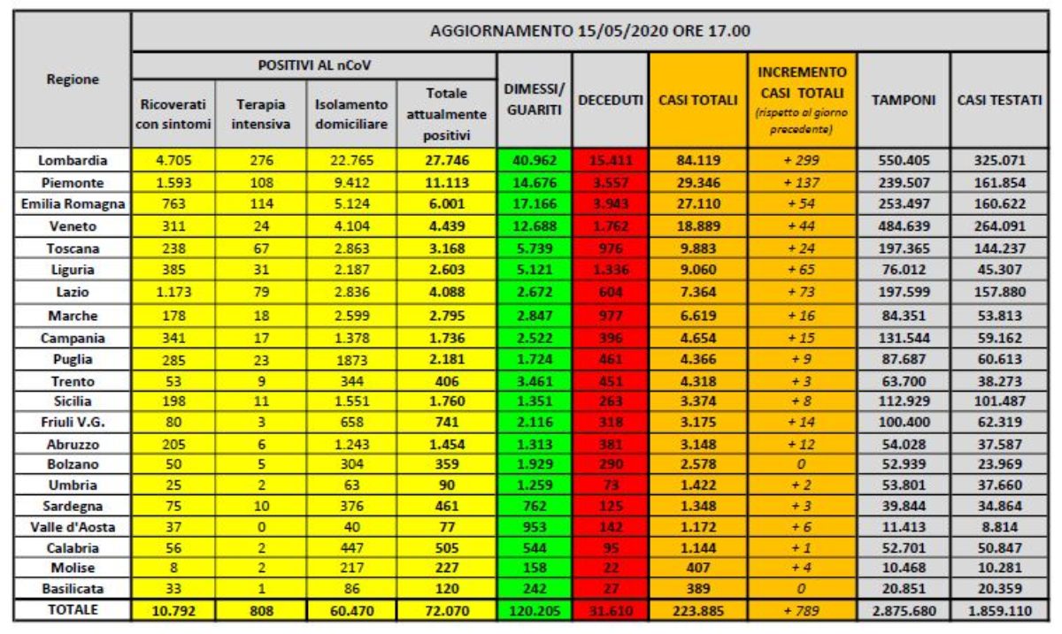 Dopo la decisione di sospendere definitivamente la consueta conferenza stampa delle 18, i dati inerenti all’emergenza Coronavirus in Italia sono stati diramati tramite un bollettino diffuso sul sito internet della Protezione Civile. Questi i numeri del bollettino di oggi, venerdì 15 maggio.