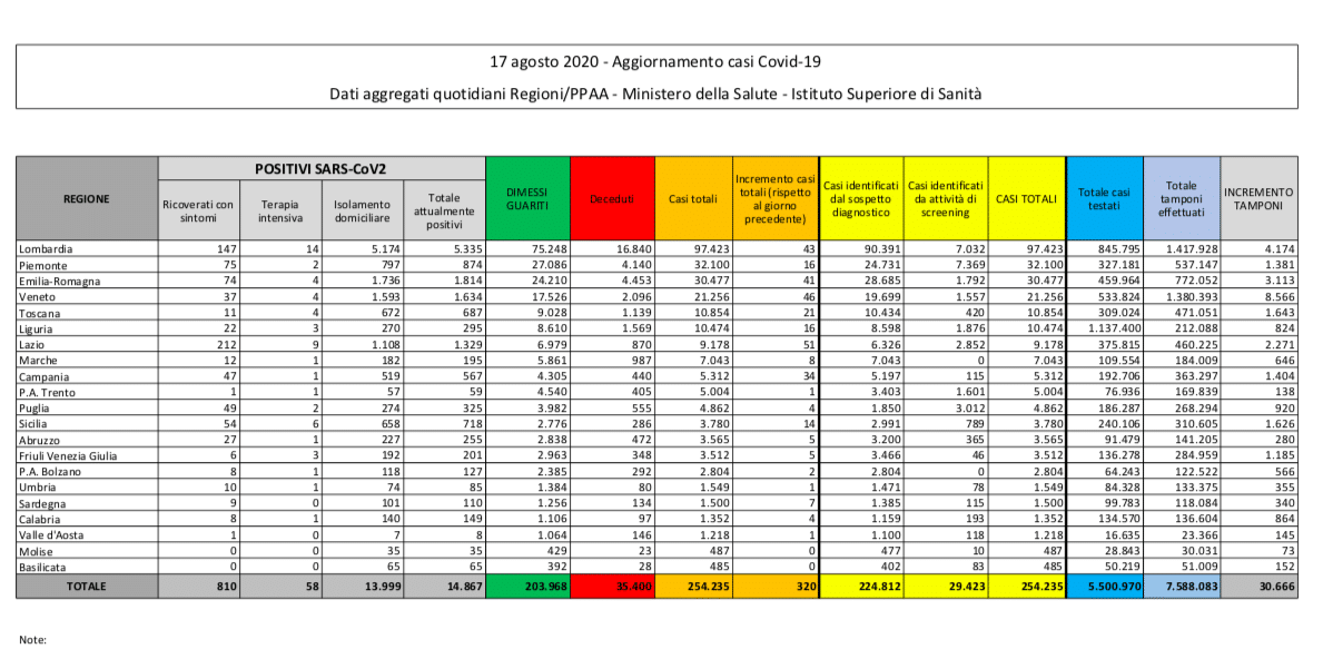Il Ministero della Salute e la Protezione Civile hanno pubblicato il bollettino sulla diffusione del Coronavirus in Italia aggiornato alla data di oggi, lunedì 17 agosto 2020.